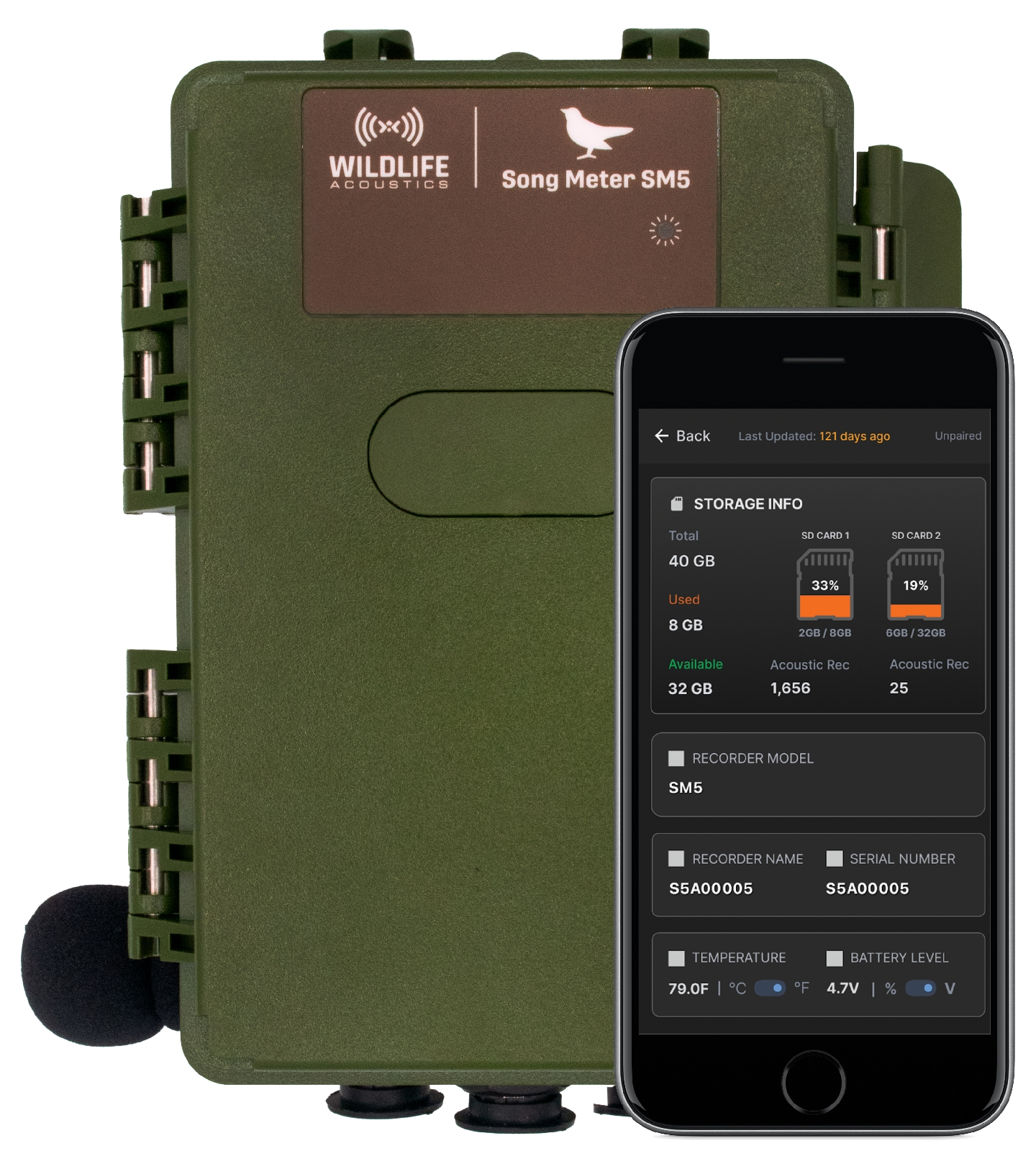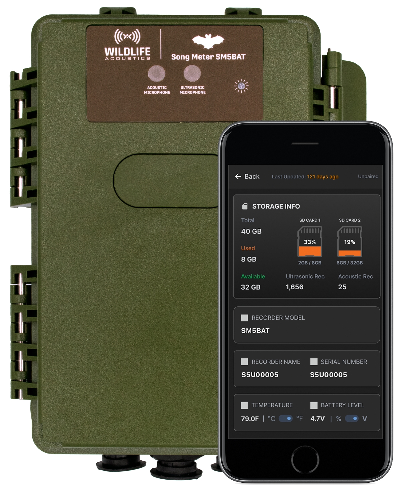 | Configuration options | iOS or Android phone or tablet (Song Meter Configurator app) or on-unit buttons/screen |